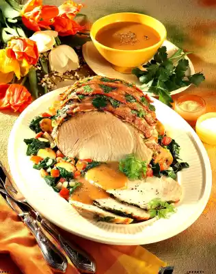Gradually pour on 1/4 litre of hot broth. Wash parsley and pluck off leaves. 20 minutes before the end of the frying time, cover the roast with slices of bacon and parsley. Clean, sort and wash the spinach. Clean, wash and slice the mushrooms. Peel the remaining onion and garlic. Chop both finely. Heat the fat. Fry onion and garlic. Brown the mushrooms in it. Add spinach and let it collapse. Clean, wash, dice and fold in the tomatoes. Take out the meat.