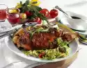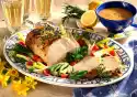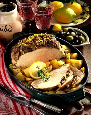 Brush the roast 15 minutes before the end of the cooking time. Cut the roast open and garnish with lemon slices and the remaining thyme.