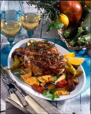 Pour white wine over the roast. Cover and chill for 3-4 hours. Turn from time to time. Then pat dry and place on a fat pan. Keep the marinade. Roast in the preheated oven (electric range: 175 °C/ gas: level 2) for approx. 1 1/2 hours. After 40 minutes, sprinkle with the marinade. In the meantime, peel and slice the onion. Clean and wash the zucchini and eggplants and cut them into bite-sized pieces. 1/2 hour before the end of the roast, spread them on the fat pan. Drizzle with olive oil.