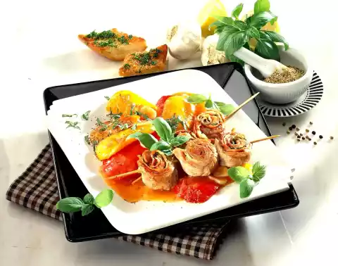 Wash the meat, pat dry, tap a little flatter. Spread tomato paste on top, season with salt and pepper and cover with bacon. Wash the basil, dab dry, remove the leaves and spread on the bacon. Roll up meat firmly, cut into slices and put on skewers. Clean, wash and cut the peppers into pieces. Peel garlic, cut into thin slices. Fry both in hot olive oil while turning for about 5 minutes.