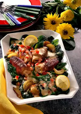 Sprinkle with sauce thickener, bring to the boil again. Season with salt, pepper and possibly some sherry. Arrange the schnitzel rolls with the sauce on the spinach. Serve garnished with lemon wheels.