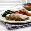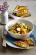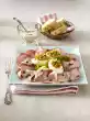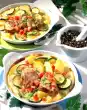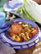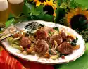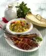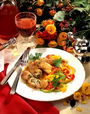 Roll up the meat and fix it with wooden skewers. Peel and finely dice the onions. Heat the oil in a pan and fry the rolls vigorously while turning. Add half of the onions, braise briefly and deglaze with stock and brandy. Bring to the boil and braise covered for about 10 minutes. In the meantime clean, wash and drain the peppers. Cut the pepper halves into fine strips on a kitchen slicer. Heat the fat in a pan. Braise the paprika and remaining onions for 2-3 minutes, season with salt and pepper and keep warm. Lift the rolls out of the stew and keep them warm as well. Add the sauce thickener to the stock while stirring and bring to the boil again briefly. Season to taste with pepper and brandy.