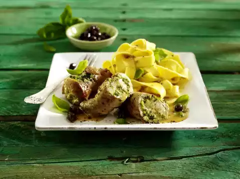 Add butter to the sauce little by little while stirring vigorously. Season to taste with salt and pepper. Add the olives and warm up briefly. Arrange pasta, roulades and sauce on plates. Sprinkle with basil leaves.