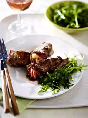 Remove the schnitzel rolls from the pan. Add wine and 100 ml water to the frying pan and bring to the boil. Season to taste with salt and pepper. Arrange schnitzel rolls with frying set and salad.