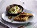 Cut mozzarella into 8 slices. Wash the basil, pluck the leaves from the stems. Wash the meat, dab dry and tap flatter. Season with salt and pepper. Spread with pesto, then cover with 1 slice of mozzarella.