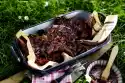 Sprinkle half of the basil leaves on top. Roll up and pin with wooden skewers.