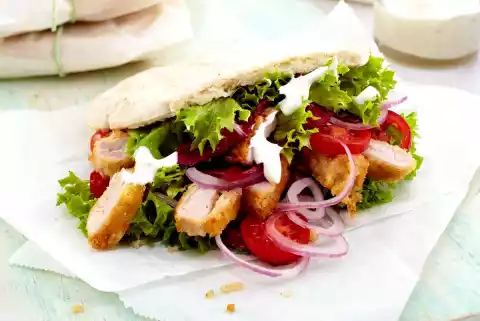 In the meantime wash and slice the tomatoes. Peel onion and cut into rings. Wash the lettuce and drain well. Take the escalope out and cut into strips. Roast the pita breads in a toaster.