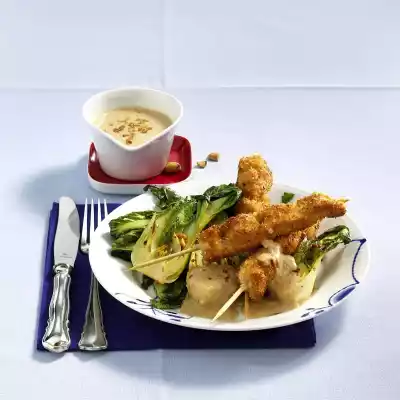Add breadcrumbs to the grated coconut and mix well. Whisk the egg in a deep plate and season with salt and pepper. First turn the skewers in flour, then pull them through the egg, drain well and finally bread them with the grated coconut. Heat 1 tablespoon of peanut oil in a pan. Fry the paksoi at medium heat for about 5 minutes. Season the vegetables with salt, pepper, asia sauce and chili flakes and finally add the chopped peanuts. Heat 2 tablespoons of oil in a frying pan and fry the skewers in 2 portions in it for about 4 minutes all around (the coconut flakes must not get too dark). Bring the sauce to the boil again and dilute with water if necessary. Arrange pak-choi, saté skewers and some sauce on plates. The rest of the sauce is extra. Serve with rice and fresh coriander