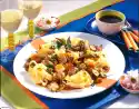 Preheat oven (electric cooker: 225 °C/circulating air: 200 °C/gas: level 4). Peel and finely dice onion. Sauté in 1 tbsp. hot oil in a saucepan. Fry rice and peanuts briefly. Sprinkle with curry and sauté briefly