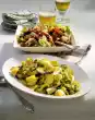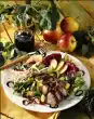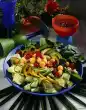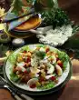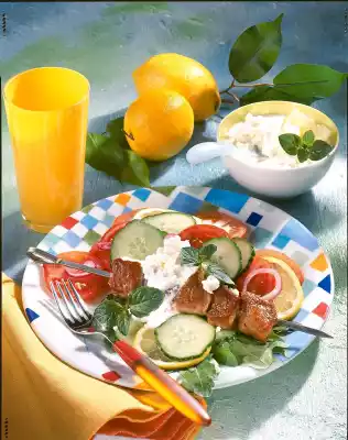 For the sauce, dice sheep's cheese. Mix yoghurt and half the cheese. Season with salt, pepper and lemon juice. Wash the salad, drain and pluck smaller. Mix the rocket and colourful salad and spread on a plate. Arrange skewer and some cheese sauce on top. Sprinkle the rest of the cheese on top. Garnish with mint. Add bread