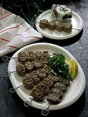 Spread another thin layer of mustard and cover with bacon slices. Roll up meat firmly and cut into slices of approx. 2 cm. Put about 4 slices of meat on each skewer. Fry on the hot grill for 3-4 minutes on each side.