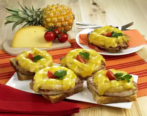 Toast bread. Remove rind from cheese and cut each slice into 6 strips. Drain pineapple and let it drain. Heat oil in a pan. Fry the meat for about 2 minutes on each side.
