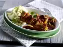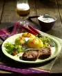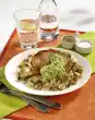 Mix sour cream and sour cream. Add cucumber and chives to the potatoes. Season with salt, pepper and 1 pinch of sugar. Heat butter. Briefly toss garlic and parsley in it and pour over the escalopes. Arrange everything, garnish