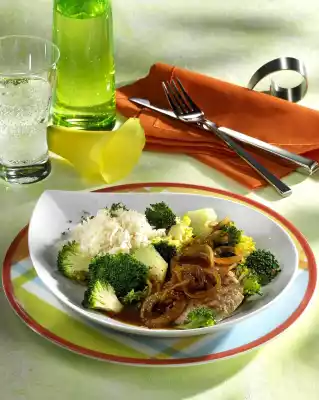 Season the meat, take it out and keep it warm. Dust onion rings with flour and sauté briefly. Stir in just under 1/8 l water and stock, bring to the boil. Season to taste with Worcester sauce, salt and pepper. Drain broccoli. Serve everything