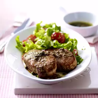 Dab schnitzel dry and cut in half. Fry in hot oil in a large pan for 3-4 minutes on each side. Season with pepper. Add caper anchovy butter to the pan, toss escalopes in it. Serve with the salad and drizzle with the butter.