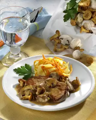 Cook the pasta in plenty of boiling salted water for about 12 minutes. Add carrots to the noodles shortly before the end of the cooking time. Heat oil in a pan. Fry the escalopes in it for 2-3 minutes on each side. Season with salt and pepper and remove. Fry the mushrooms and chanterelles in the frying fat. Deglaze with the porcini mushrooms in the soaking water and broth. Bring to the boil and cook for 5 minutes. Stir in sauce thickener, bring to the boil again. Refine sauce with sour cream. Season to taste with salt and pepper. Add cutlets to the sauce and warm up briefly.