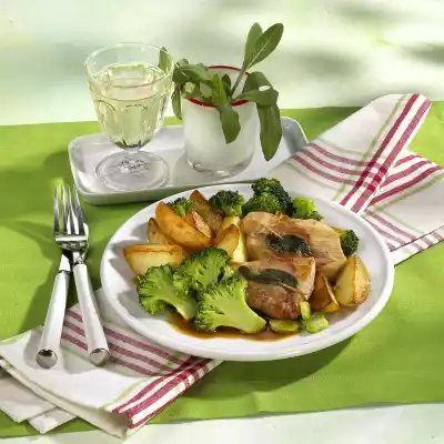Place 1/2 slice of ham and a sage leaf on each turkey escalope and fix with a wooden skewer. Turn the escalopes in flour. Tap off excess flour well. Clean and wash broccoli and divide into florets.