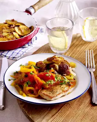 Arrange the fried potatoes, schnitzel and paprika vegetables on plates, sprinkle with marjoram and garnish.