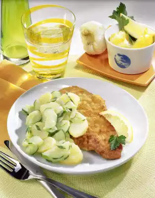 Fry in hot oil for about 3 minutes on each side. Season the potato salad to taste and arrange everything. Garnish with lemon