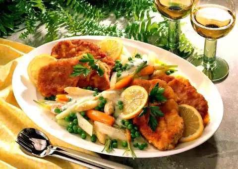 Melt the fat and sweat the remaining flour in it. Add cream and 150 ml stock while stirring continuously. Flavour with salt and pepper. Arrange schnitzel and vegetables on a plate. Pour sauce over them. Serve garnished with lemon slices and parsley. Serve with new potatoes