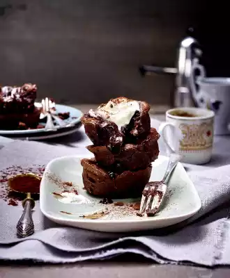 Chop the chocolate and melt it with the butter in a small pot while stirring at low heat. Beat the eggs, egg yolks and 60 g sugar with the whisk of the hand mixer for about 5 minutes until creamy.