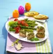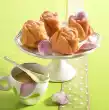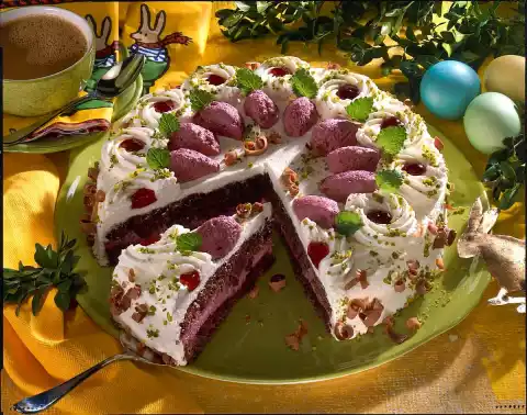 Warm the rest of the jelly, let it cool down a bit and fill the curls with some jelly each time. Put the cake in a cool place for about 10 minutes. Use two moistened teaspoons (warm water) to cut 12 small dumplings (eggs) from the remaining cream and place them directly on the cake.