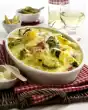 Deglaze with stock and let it boil down for about 5 minutes at high heat. Add processed cheese and let it melt in it. Fold in potato noodles and marjoram, season again. Pour into an ovenproof dish (approx. 2 litres capacity). Rub the gouda cheese over it. Bake in a preheated oven (electric cooker: 200 °C/ convection oven: 175 °C/ gas: level 3) for approx. 20 minutes. Serve sprinkled with fresh marjoram