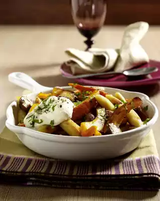 Finely mash the feta with a fork. Mix with sour cream. Season with salt and pepper. Wash parsley and cut into fine strips. Season the potato noodle-pumpkin-pan with salt, pepper and some rose paprika.