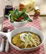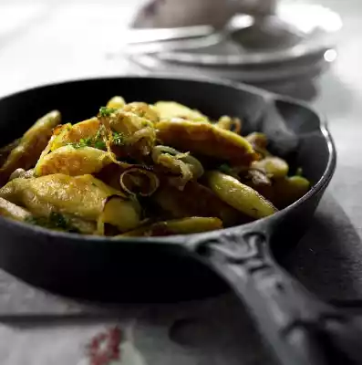 Add the onions to the potato noodles. Wash and chop the parsley and sprinkle over it.