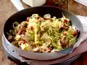 Cut tomatoes into fine strips. Dice corned beef. Remove the lid from the Brussels sprouts pan. Let the rest of the liquid simmer until the Brussels sprouts start to fry lightly in the pan again.