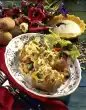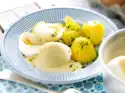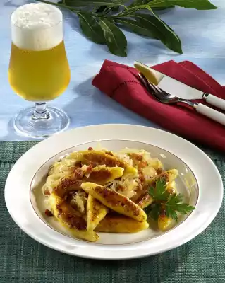 Drain potatoes, rinse with cold water and peel. Press the potatoes through a potato ricer. Add flour, cornstarch, egg yolk, salt, pepper and nutmeg and knead briefly. Form finger-thick potato noodles with floured hands and let them simmer in portions in lightly boiling salt water. When the potato noodles float on top, remove them with a skimmer and let them drain well. Heat the fat in a pan and fry the potato noodles until golden brown, turning them over. Arrange on plates together with sauerkraut and serve garnished with parsley
