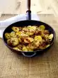 Wash the potatoes and cook in boiling water for 20 minutes. In the meantime peel and chop the onions. Cut the bacon into fine cubes as well. Heat the oil in a pot, add the bacon and fry the onions briefly. Add sauerkraut and braise well. Deglaze with stock and apple juice, add bay leaf and juniper berries and season with salt and pepper. Cover and braise for 30 minutes.