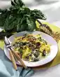 Clean, wash and break the beans into pieces and cook them in boiling salted water for 12-15 minutes. Clean, wash and cut the peppers into pieces. Peel and finely chop the onion. Cut meat into strips. Heat 2 tablespoons of oil in a large pan. Fry the potato noodles until golden brown and remove. Add 1 tablespoon of oil to the pan and heat it up. Fry the meat for about 4 minutes. Season with salt and pepper and take out. Drain the beans. Fry the vegetables in the frying fat for about 3 minutes.