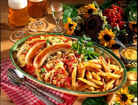 Form finger-thick rolls (potato noodles) from the dough with floured hands. Let them stand in plenty of boiling salted water for 2 - 3 minutes until they float on top. Lift them out with a skimmer and let them drip off. Peel onion and lard with cloves. Fry the bacon in 20 g lard. Add sauerkraut, onion, bay leaf and juniper to the cabbage, deglaze with beer and cook for 20 minutes. Add pepper strips and cook for 10 minutes. Wash parsley, dab dry and chop except for a few leaves to garnish. Fry the potato noodles in the remaining lard in several portions until golden brown. Season sauerkraut with salt and pepper.