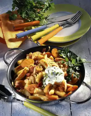 Leave the bacon in it until crispy and take it out. Fry the potato noodles in the bacon fat until golden brown, turning carefully. Season with salt, pepper and nutmeg. Add fat and heat up. Fold in onions and carrots and fry for another 5 minutes while turning. Wash parsley and chives and dab dry. Finely chop parsley, except for a little bit for garnishing, and fold into the pasta pan. Season with salt, pepper and nutmeg. Cut the chives into small rolls. Season crème fraîche with salt and pepper, stir in chives. To serve, put a thick blob of crème fraiche on the potato noodles. Serve garnished with parsley