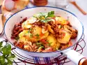 Clean, wash, quarter and cut the pointed cabbage into strips. Cut tomatoes into strips. Heat butter in a large deep frying pan. Add the minced meat in flakes and fry vigorously. Fry uncooked potato noodles for about 5 minutes.