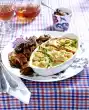 Deglaze everything with approx. 100 ml water. Bring to the boil, stir in broth and simmer for about 5 minutes. Season to taste with salt, pepper and nutmeg. Stir sour cream until smooth and spread it on top.