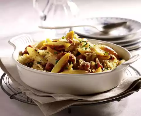 Take out the pasta and keep it warm. Fry the meat and onions in the frying fat. Lightly squeeze the sauerkraut, add the cabbage to the pan and braise for about 10 minutes. Add 100 ml water and season with salt, pepper and sugar.