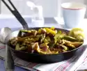 Wash the meat, dab dry and cut into cubes. Peel onions and cut into strips. Heat lard in a pan. Fry the potato noodles for about 5 minutes while turning. Season with salt, pepper and nutmeg.