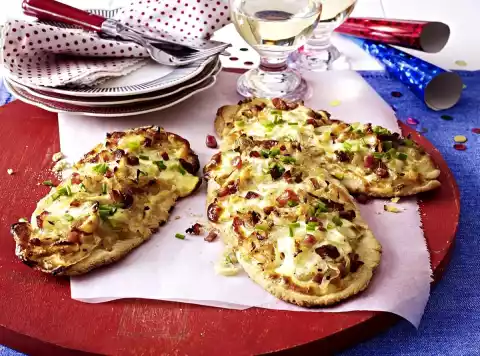 Mix sour cream, eggs, approx. 1 teaspoon salt and a little pepper briefly. Put it in a cold place. Form the dough into a thick roll and cut it into 16 pieces of the same size. Roll out to flat, oval flat cakes (approx. 10 x 22 cm) on a floured work surface. Place approx. 4 flat cakes on a baking tray lined with baking paper and brush each with 1 tbsp. sour cream. Spread some onion and bacon mixture on each and sprinkle with 2-3 tbsp. sour cream again.
