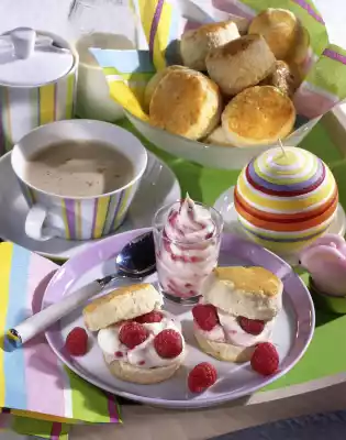 Sift flour and baking powder, mix with salt and diabetic sweetener. Add cold butter in pieces and knead. Add milk and quickly work everything into a smooth dough. Cover and chill for about 20 minutes. Knead dough briefly and roll out to a thickness of approx. 2 cm on a floured work surface. Cut out 12 circles with a round cookie cutter (5 cm Ø). Place the scones on a baking tray lined with baking paper and brush with whisked egg yolk. Bake in the preheated oven (electric cooker: 175 °C/ convection oven: 150 °C/ gas: level 2) for about 15 minutes. In the meantime, mix the halves of the raspberries and lightly add mascarpone. Season to taste with a little sweetener if necessary. Serve the scones immediately with raspberry cream and remaining raspberries