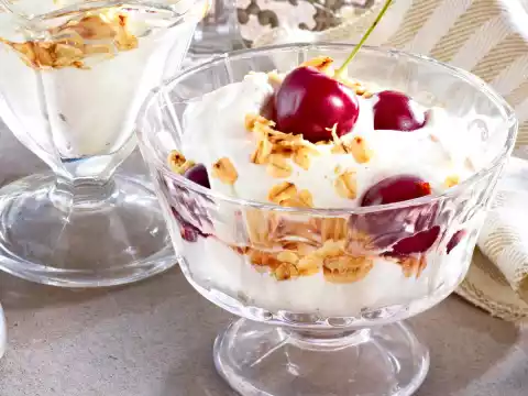 Whip the cream until stiff, adding honey. Fold in kirsch. Wash the cherries and put 4 cherries aside. Stone the remaining cherries. Loosely mix the cherries, 3/4 of the oat flakes and cream and pour into dessert glasses. Serve immediately, decorated with cherries and the remaining oat flakes