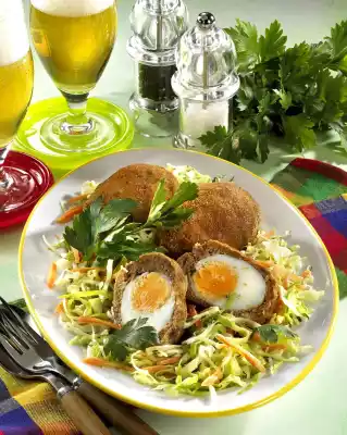 Wrap each hard-boiled egg with the minced dough thinly and press well. Whisk the rest of the egg and turn the coated eggs first in flour, then in egg and the rest of the breadcrumbs. Heat the fat in a pot and fry 2-3 eggs at medium heat for 6-8 minutes until crispy brown. Drain well on kitchen paper. For the raw vegetables, clean the cabbage and cut into fine strips. Peel and wash carrots and cut them into fine sticks. Mix vinegar, salt and pepper and first beat in oil and then cream. Mix vinaigrette with cabbage and carrots. Arrange eggs and raw vegetables on a plate.