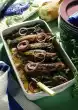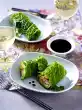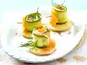 Finely chop the parsley and dill. Add the herbs to an egg portion and stir in. Wash, clean, quarter and seed the tomato. Cut into small cubes. Slice the curly pepper. Cut salmon into strips.
