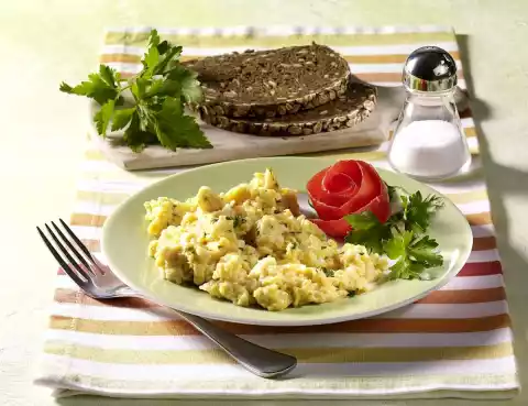 Heat the fat in a frying pan, add the eggs and allow to set while stirring. Wash the tomato and peel with a peeler. Wrap the peel into a rose. Arrange eggs on a plate and garnish with cucumber slices, tomato rose and parsley.