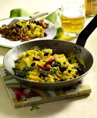 Mix in peas, beans and corn. Heat 1 tablespoon of oil in a frying pan. Add the eggs. Fry over medium heat, pushing them together frequently, until the egg has set. Season the meat ragout once again.