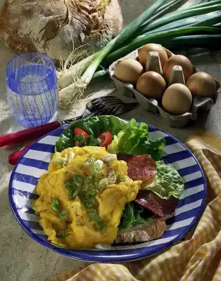 Push together several times with a spatula. Sprinkle with spring onions. Spread bread with fat. Cover with salad leaves and slices of salami. Add some scrambled eggs and arrange on a plate with lettuce, tomato and parsley.