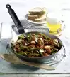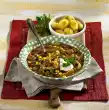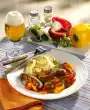 Sprinkle with flour. Deglaze with cream and vegetable stock. Bring to the boil again while stirring and season to taste. Warm the leek in it. Whisk eggs and milk. Season with salt, pepper and paprika. Stir in the rest of the hot fat and let it stand for about 5 minutes. In the meantime cut liver cheese slices in half. Fry in hot oil for 1-2 minutes on each side. Wash the chives and cut into small rolls. Arrange scrambled eggs on meat loaf and leek vegetables.