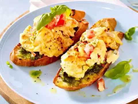 manufacturer) roast for about 10 minutes. Spread with pesto, put scrambled eggs on the slices of bread, drizzle with remaining oil and garnish with remaining basil. Sprinkle with coarse pepper.