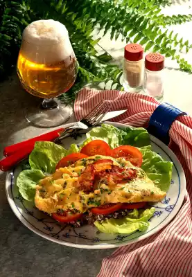 In the meantime, whisk eggs and milk, season with salt, pepper and nutmeg. Remove bacon from the pan. Let the whisked egg falter. Push them together carefully with a spatula. Clean, wash and drain the salad.